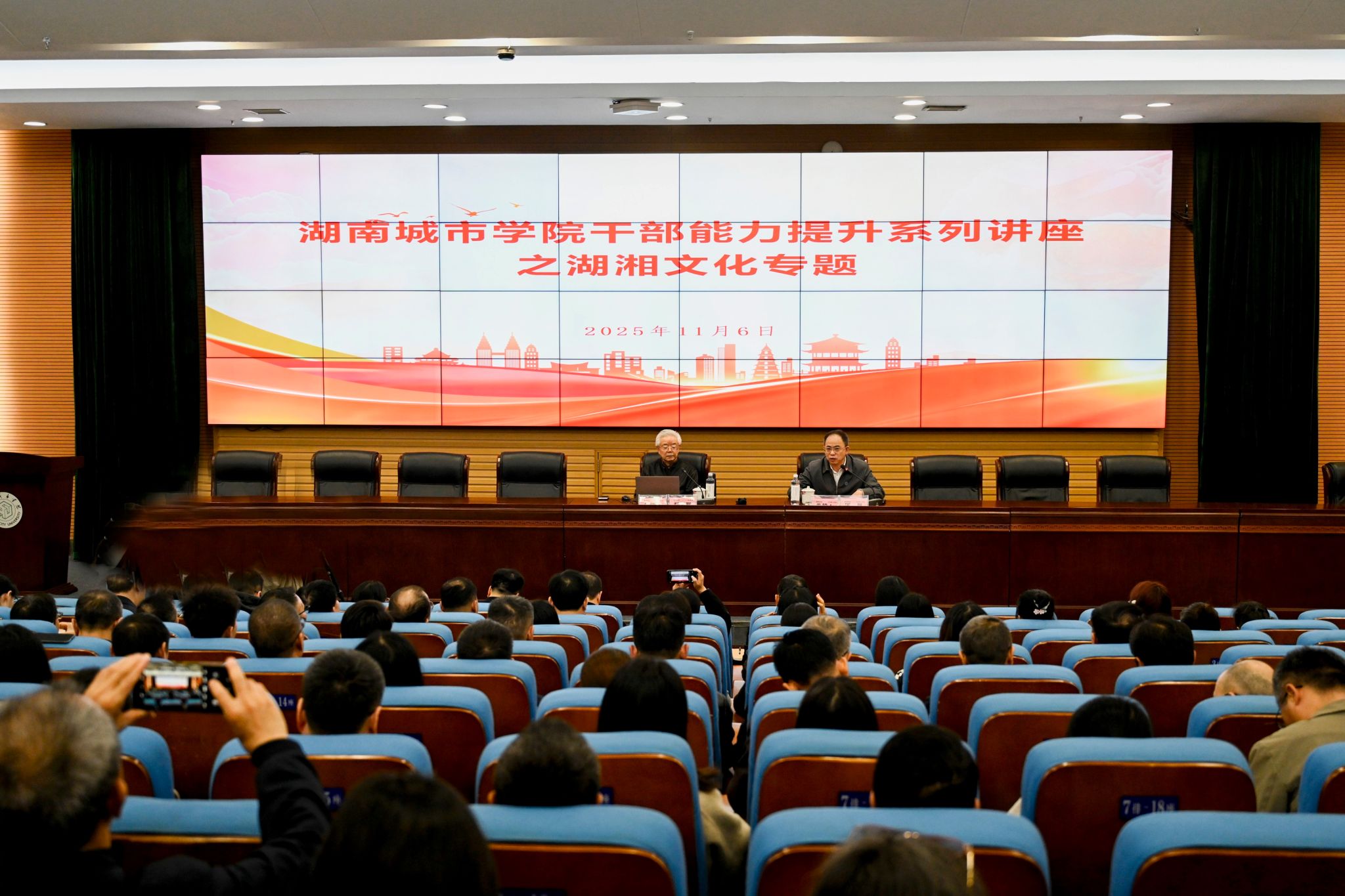 本网讯 11月6月,学校办学55周年学术活动周暨干部能力提升系列讲座之湖湘文化专题讲座在图书馆报告厅举行。湖南师范大学历史文化学院教授,省委宣传部原副部长,省社科联原主席郑佳明受邀作题为“湖湘认识论:从经世致用到实事求是”的专题授课。全体在家校领导与数百名师生齐聚一堂,共同领略湖湘文化的博大精深与独特魅力。