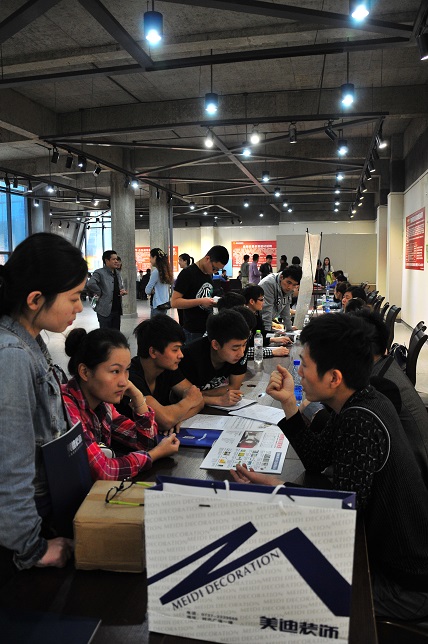 (本网讯)不用出门,在校园就能够参加招聘会。4月29日下午,苹果装饰等11家知名装饰设计公司“组团”在美艺楼108教室举办了针对美术与艺术设计学院学生的专场招聘会。