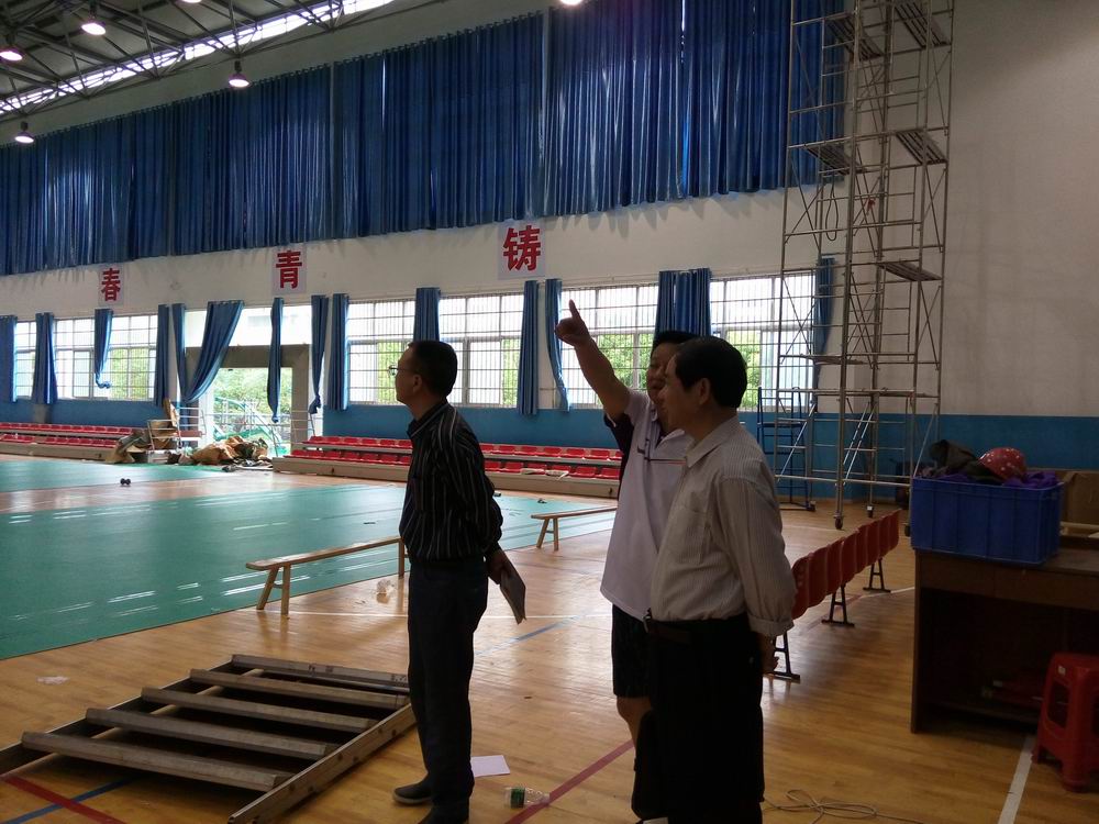 丁亮中一行来到了2015年省大学生羽毛球比赛主赛场,现场查看了训练馆场地灯光、地胶安装,舞台搭建、场地卫生,宣传橱窗等,并就有关的情况现场与体育学院和后勤处负责人进行了交流。