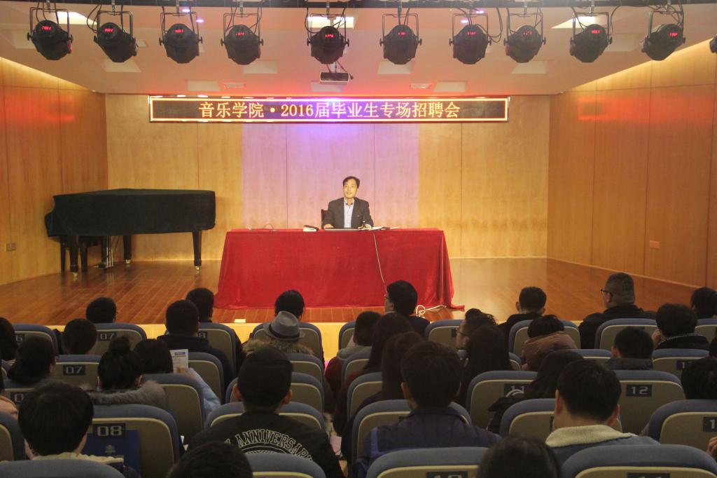 (本网讯)为深化专业建设内涵,拓宽毕业生就业渠道,促进毕业生充分就业,11月22日,音乐学院在音乐楼206音乐厅召开了2017届毕业生专场招聘会。深圳小伙伴艺术团、上海伽音艺术学校、广东雅宝集团有限公司、浙江多乐米艺术培训学校、宁乡维也纳钢琴学校、南县燕山琴行等单位应邀参加了本次专场招聘会,音乐学院相关负责人、辅导员、就业专干与两百余名毕业生参加了招聘会。