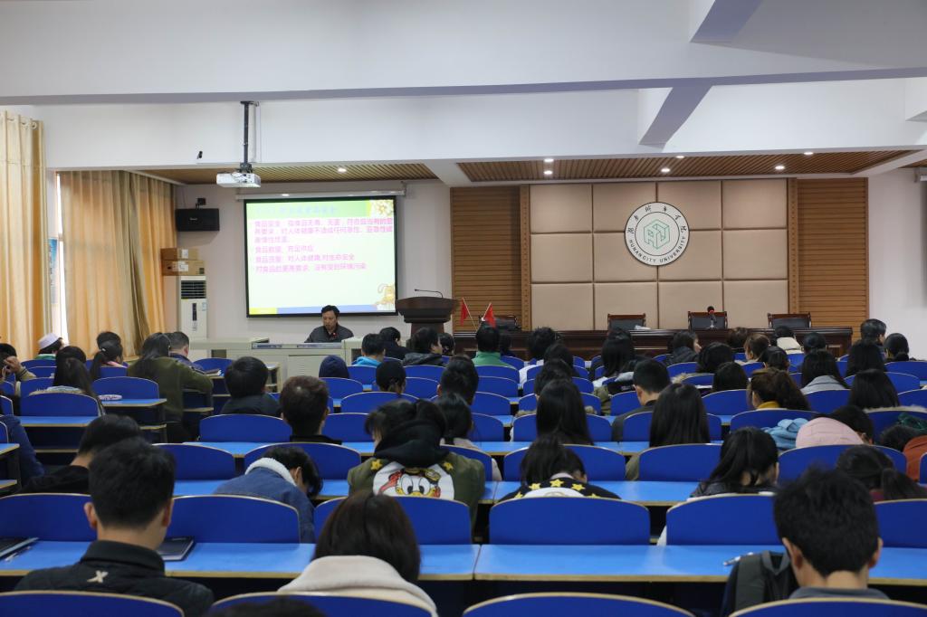 (本网讯)3月14日下午,我校邀请益阳市食品药品监督管理局餐饮服务安全监管科科长熊剑波作了一堂食品安全知识讲座。讲座在二办公楼三楼招聘室举行,基建与后勤管理处负责人,餐饮科管理人员、3个餐饮公司代表、学生伙食管理委员会成员、各二级学院学生代表共计180余人听取了讲座。
