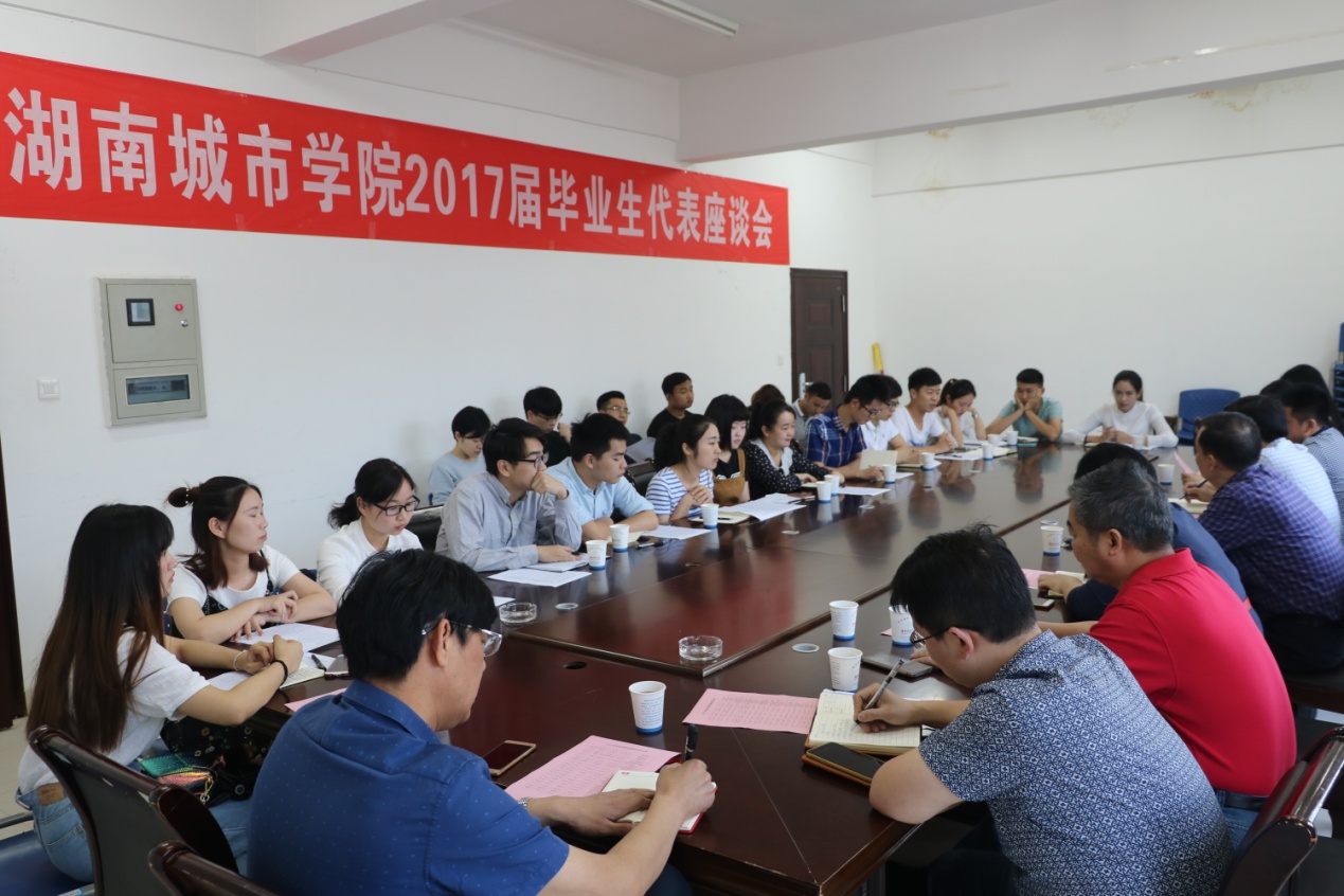 (本网讯)5月26日上午,我校2017届毕业生代表座谈会在二办公楼518会议室举行。副校长雷存喜、谭献良,学校相关部门负责人,来自10个学院的17位毕业生代表以及3名肄业生代表参加了此次座谈会。