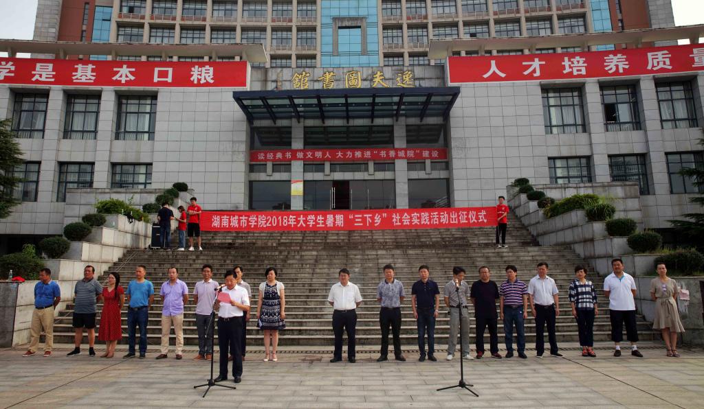 (本网讯)深入学习贯彻习近平新时代中国特色社会主义思想,引领教育广大城院青年学生勇做担当民族复兴大任的时代新人,切实在感受改革开放40年取得的新成就新面貌的生动实践中受教育、长才干、作贡献,7月5日上午8:00,我校2018年大学生志愿者暑期文化科技卫生“三下乡”社会实践活动出征仪式在兴城广场隆重举行。校党委书记罗成翼、党委副书记汤放华、副校长谭献良出席活动,学校德育工作小组成员、各学院团委书记、指导教师及学生志愿者代表参加活动。谭献良主持仪式。