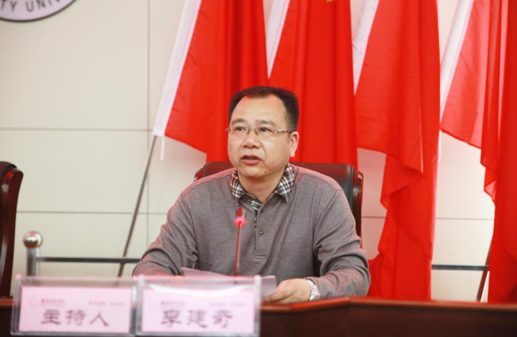 (本网讯)2019年4月24日,益阳市委常委、宣传部长胡立安应邀来校,为我校师生作了一堂题为“坚定文化自信 争做新时代合格接班人”的报告。校长李建奇、副校长雷存喜,二级学院党委(总支)书记、副书记和全体辅导员,马克思主义学院教师代表和党务部门相关人员以及200余名学生代表参加了报告会。报告会由李建奇主持。