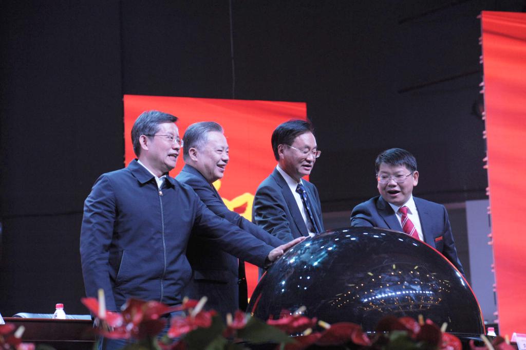 唐之享、李友志、瞿海、罗成翼共同启动水晶球,标志米兰平台纪念办学50周系列活动启动。