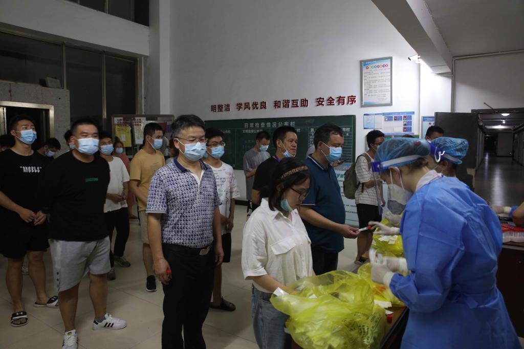 汤放华与暑期留校师生进行核酸检测。