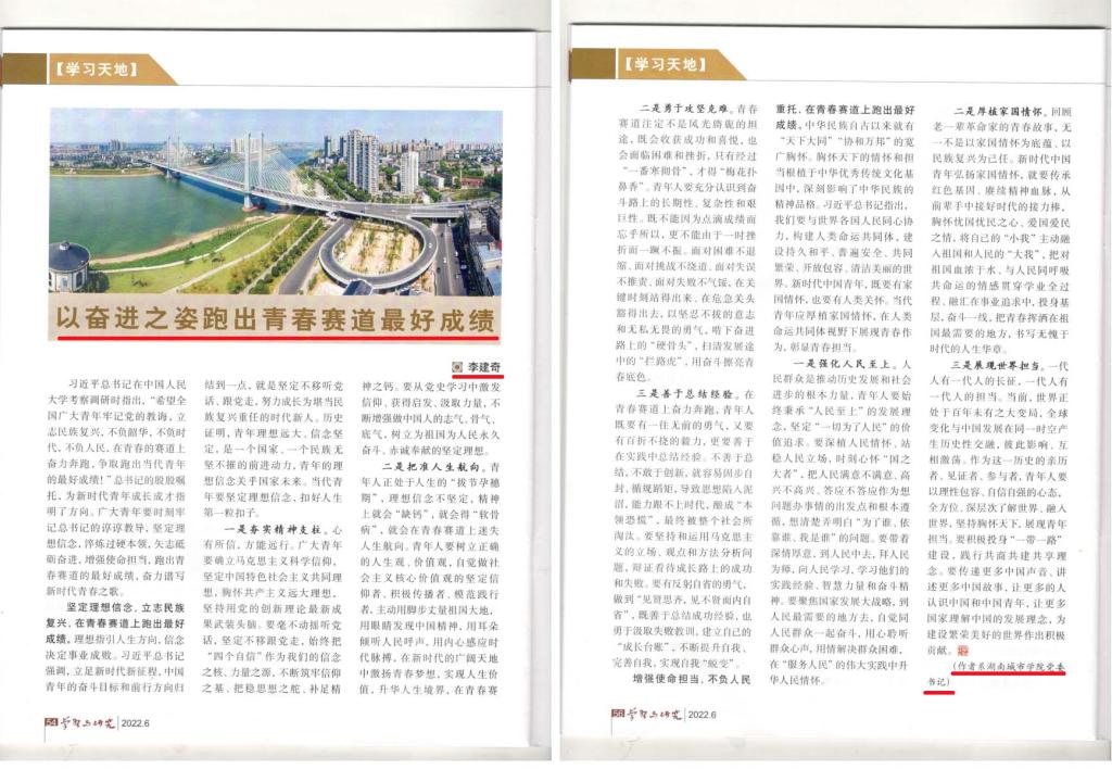 本网讯 中央政策研究室主办《学习与研究》2022年第6期发表我校党委书记李建奇署名文章《以奋进之姿跑出青春赛道最好成绩》,目录在《人民日报》(2022年6月16日第13版)刊登。现全文附后。