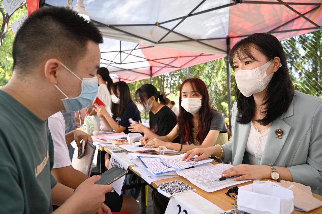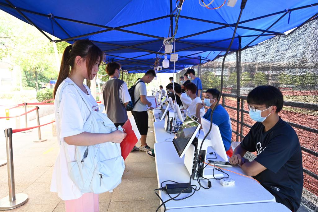 早上8点不到,学校校门口就已是人潮涌动。扫场所码、测量体温、查验健康码行程码、出示48小时内核酸检测阴性证明和录取通知书……在学校东、南、西、北四个校门处,“新橙子”们间隔1米排着长队,从临时搭建的报到通道中依次进入校园,并在志愿者的引导和帮助下前往迎新报到处。