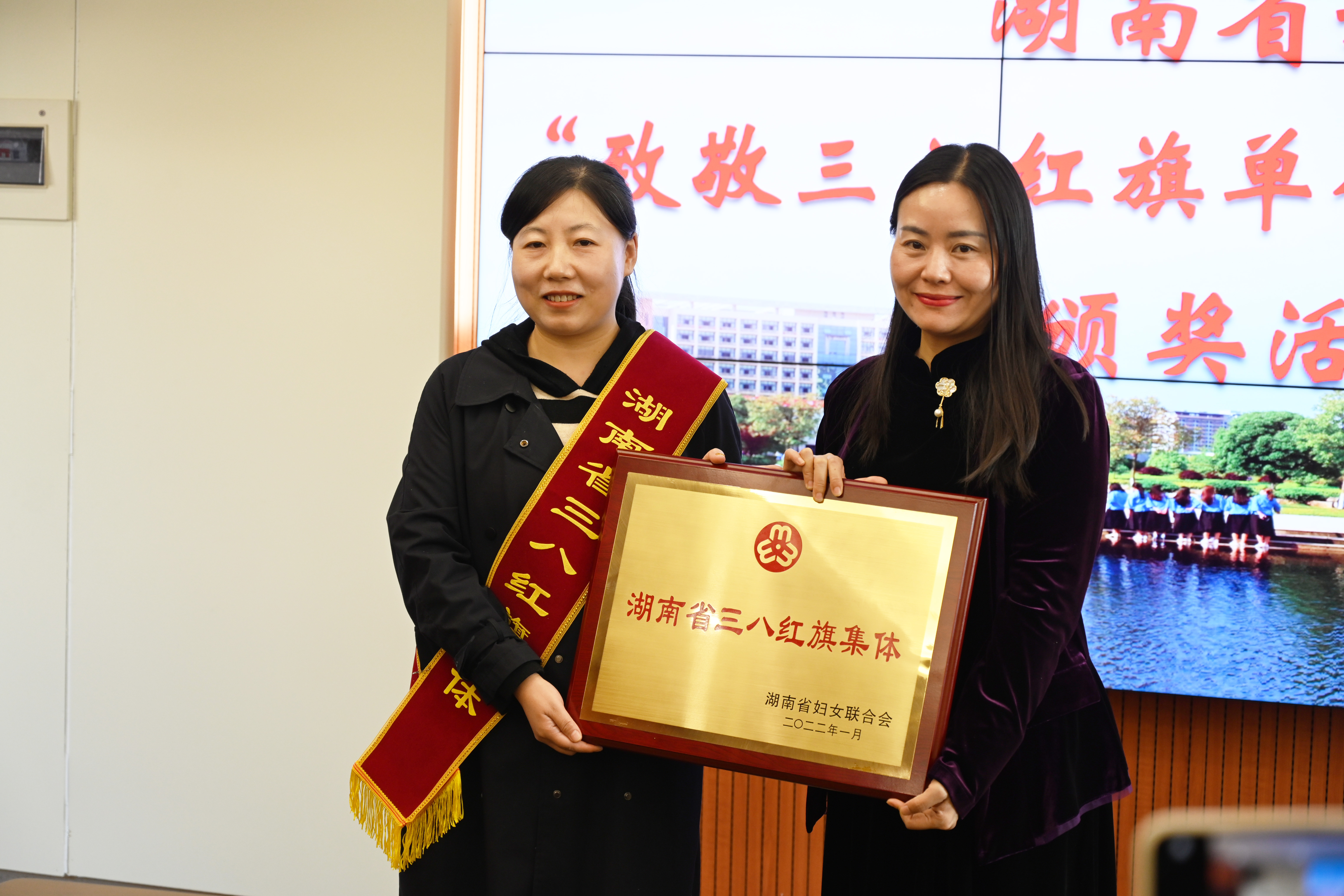 本网讯(记者/文彦波 通讯员/王锋娟)11月2日下午,省妇联副主席周荣一行来到米兰平台开展“致敬三八红旗手·送奖到基层”活动,为荣获湖南省“三八红旗集体”荣誉的马克思主义基本原理概论教研室颁奖。学校党委副书记何旭娟,校工会、马克思主义学院等单位相关负责人出席授奖仪式。