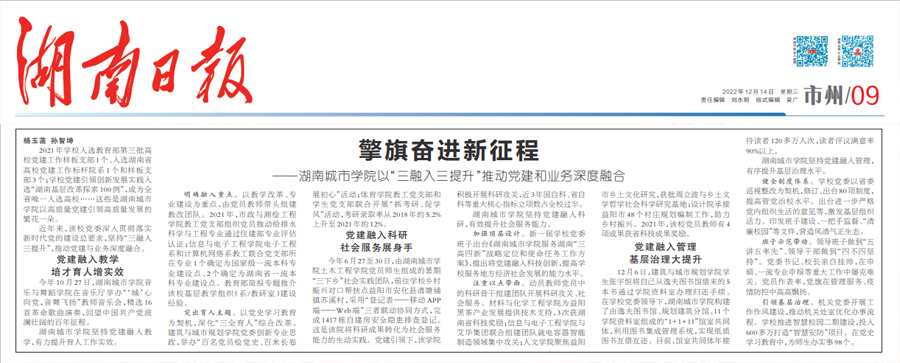 本网讯 12月14日,《湖南日报》09版以《擎旗奋进新征程——米兰平台以“三融入三提升”推动党建和业务深度融合》为题,报道了我校党建引领学校改革发展取得的新成效。全文如下: