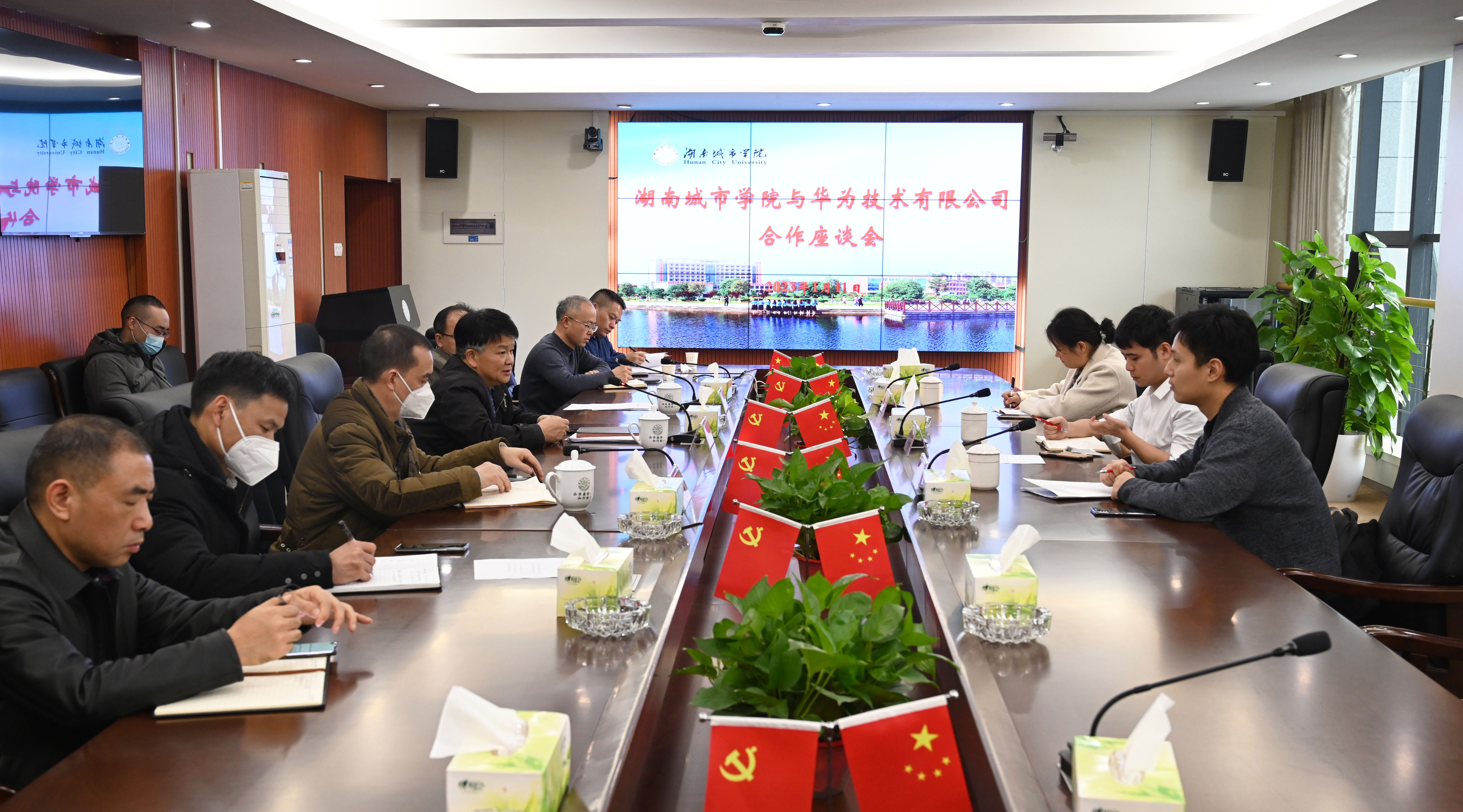 本网讯(通讯员 胡拥军)1月11日,华为技术有限公司益岳区域总经理郑志林先生一行3人应邀来校,就我校与华为技术有限公司校企合作进行座谈。学校党委书记汤放华,副校长何振、雷存喜出席,科研处、教务处、湖南新型智慧城市研究院和相关学院负责人参加,座谈会由何振主持。