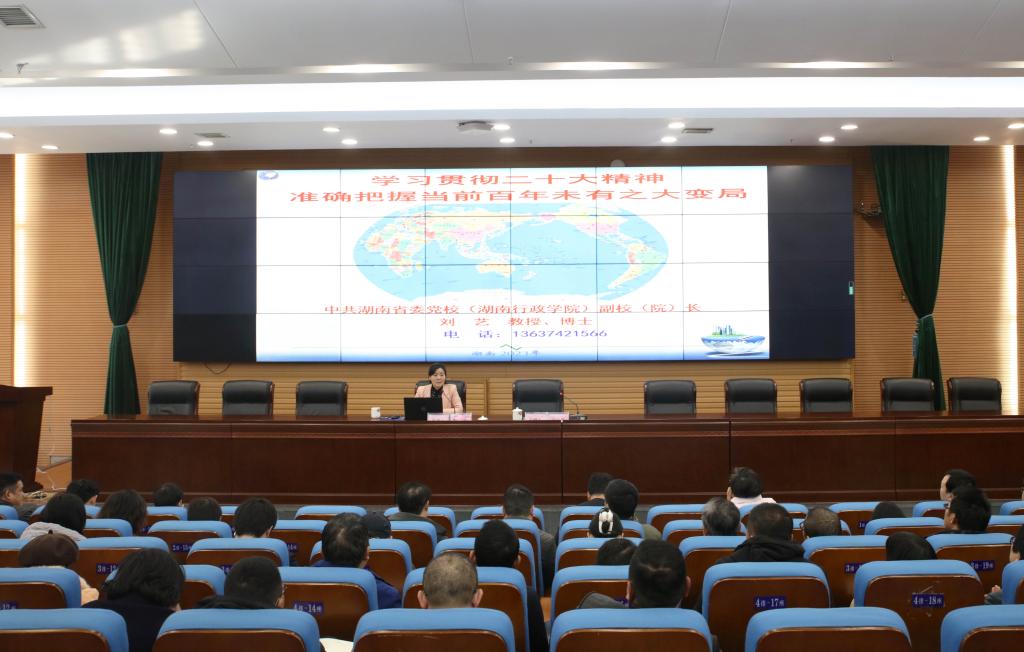 刘艺以《学习贯彻二十大精神 准确把握当前百年未有之大变局》为题,从准确把握百年未有之大变局的主要特点、科学研判百年未有之大变局带来的机遇与挑战、正确应对世界大变局的中国智慧与中国道路等方面,对党的二十大精神进行了系统阐释和深入解读。她表示,要趋利避害,积极应对百年未有之大变局带来的挑战;要审时度势,维护世界的和平、发展与合作时代主题;要抓住机遇,积极推动全球治理体制变革。