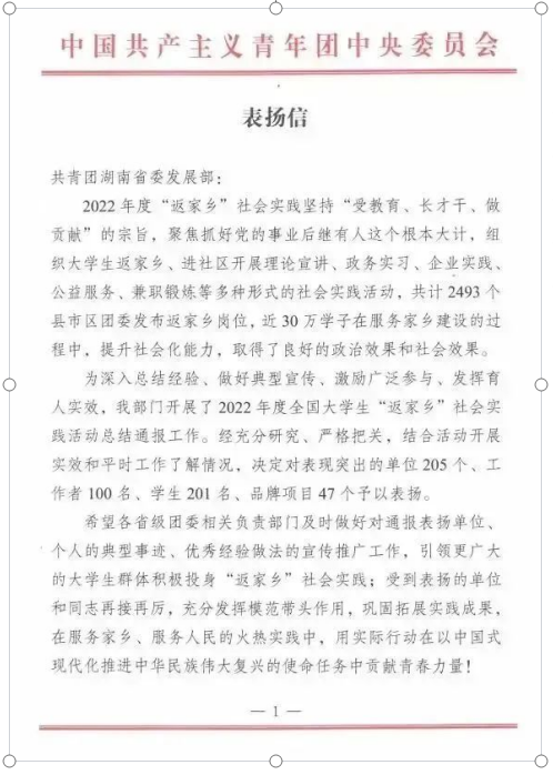 新湖南客户端8月17日讯(通讯员旷茜)近日,共青团中央通报表扬了一批在2022年度全国“返家乡”社会实践活动中表现优秀的单位、个人及品牌项目。本次“返家乡”社会实践活动,共计2493个县市区团委发布返家乡岗位,近30万学子积极参与家乡建设大潮,共有201名学生因表现突出获得表彰,我省株洲市渌口区青年学子孙颖在本次表彰名单之中。