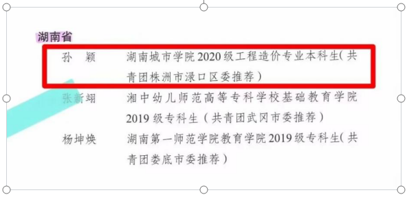 本网讯 近日,共青团中央通报表扬了一批在2022年度全国“返家乡”社会实践活动中表现优秀的单位、个人及品牌项目。本次活动共有201名学生因表现突出获得表彰,湖南省仅3人获表彰,我校土木工程学院工程造价专业2020级2003906班学生孙颖在本次表彰名单之中。新湖南等媒体对此进行了报道,现全文转载如下: