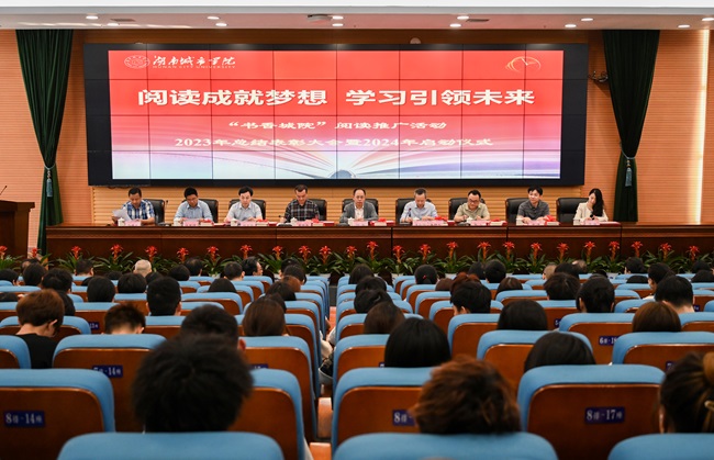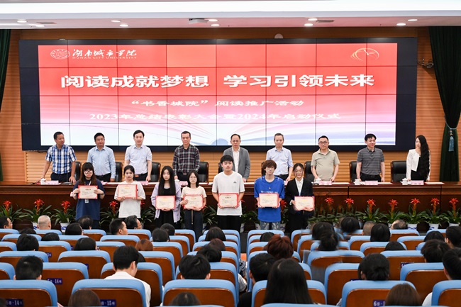 本网讯(通讯员 龙嵛葭)4月26日上午,我校在图书馆报告厅举行“书香城院”阅读推广活动2023年总结表彰大会暨2024年启动仪式。校长何振、副校长夏宏宇、雷存喜、益阳市图书馆相关负责人出席。