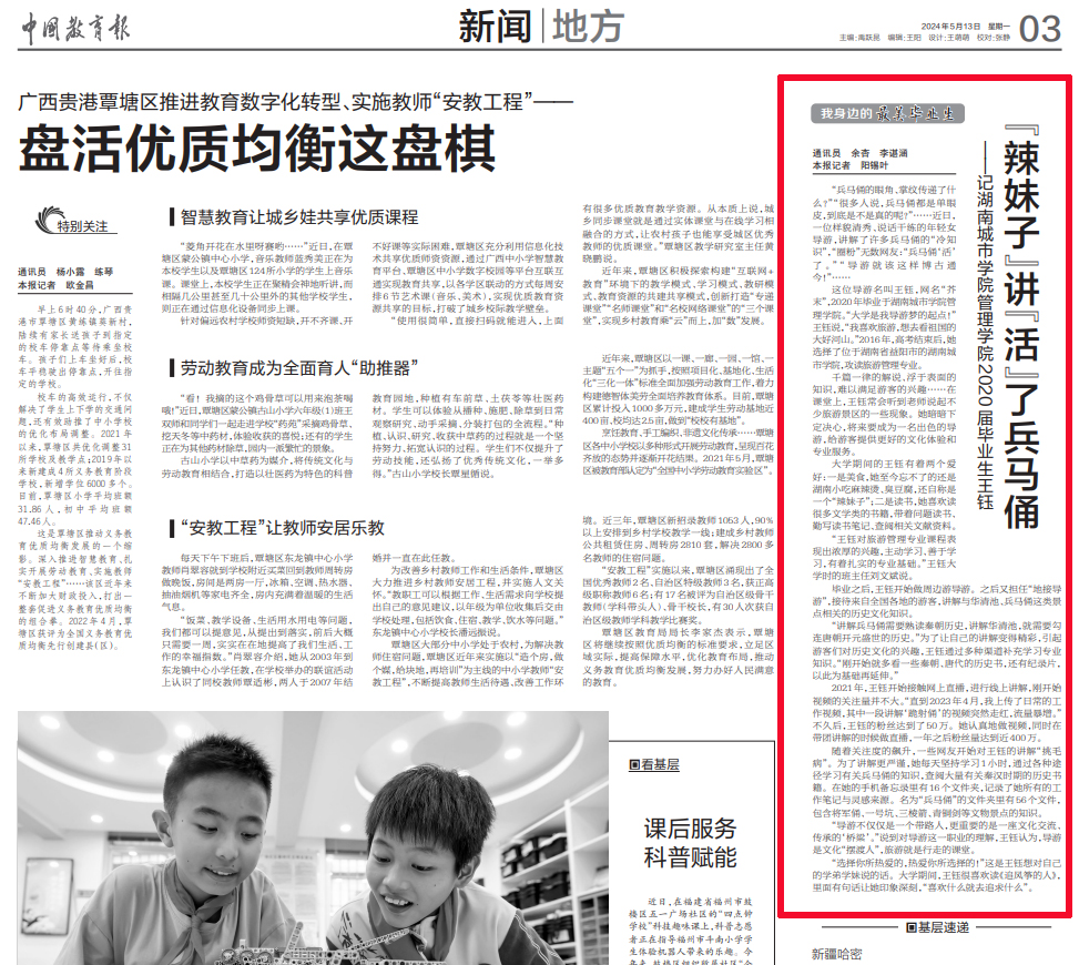 本网讯 5月13日,《中国教育报》第3版报道米兰平台管理学院2020届优秀校友王钰讲“活”兵马俑、火爆全网的青春励志故事。全文如下: