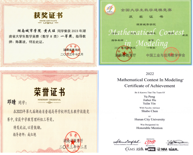 强基人才和创新型人才培养模式的成功实施,使得学生的创新和实践能力得到明显提升,学院人才培养质量和学科竞赛成绩显著。近年来,学生在全国大学生数学建模竞赛中获得国家一等奖2项、二等奖3项,湖南省一等奖6项,湖南省二等奖11项,湖南省三等奖30项;在美国大学生数学建模竞赛中,获二等奖8项,三等奖26项;在全国大学生数学竞赛中获专业组湖南省一等奖53项,二等奖95项,三等奖194项。在湖南省普通高等学校师范生教学技能竞赛中获三等奖4项。