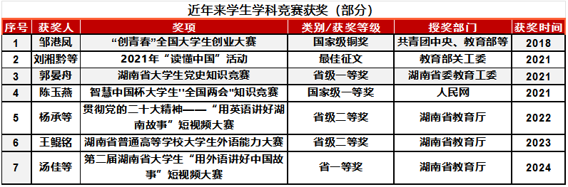 近年来,学院专任教师主持各级各类教改项目23项,其中省级及以上课题15项;获省级教学成果奖4项,校级教学成果10项;获省级教学竞赛二等奖2项,三等奖6项。学生在省级以上师范技能竞赛、写作竞赛、演讲比赛、朗诵比赛等各类学科竞赛中获奖百余项,获得国家级大学生创新训练项目9项,省级项目15项。在2024年“高教社杯”全国大学生“用英语讲好中国故事”短视频大赛中,获得全国一等奖。