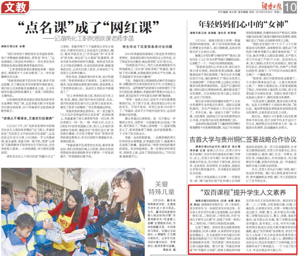 《湖南日报》3月26日第10版报道我校推进以“双百课程”为核心的实训课程教学改革