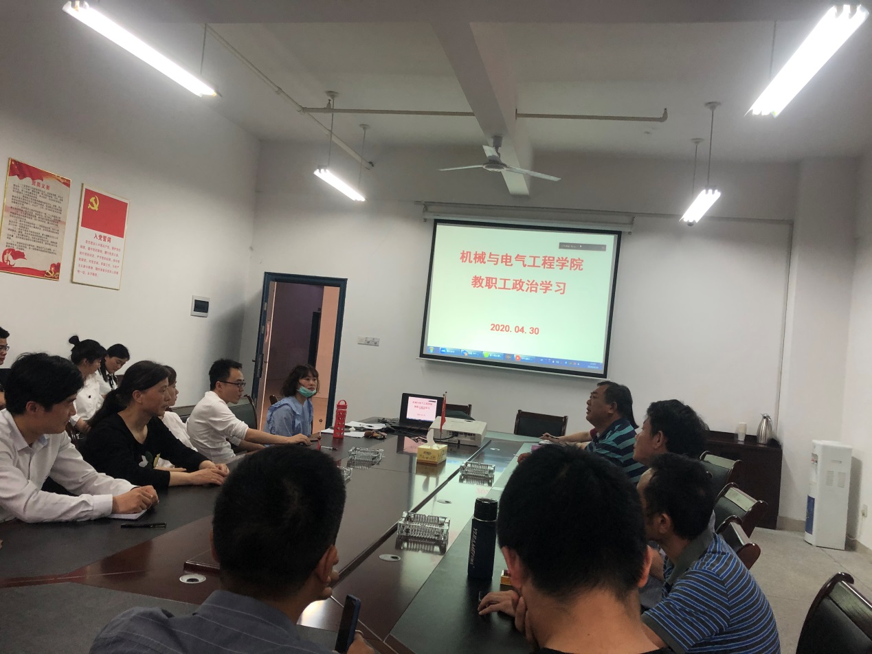 进一步贯彻传达米兰平台四届五次教职工、工会会员代表大会成果和精神,2020年4月30日下午,机械与电气工程学院在会议室召开了全院教职工政治学习。由于疫情的影响,本次政治学习采取现场学习与线上会议相结合的形式举行,会议由党总支书记徐畅贤主持。