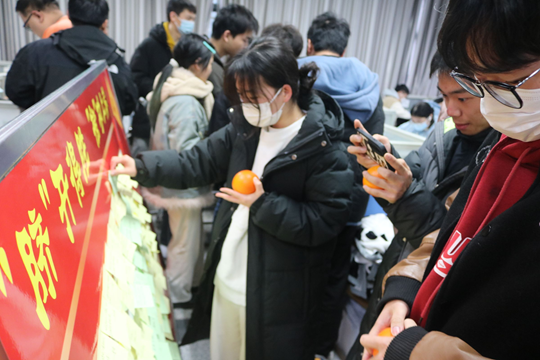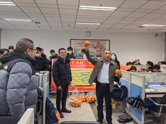 学院领导、老师与同学们亲切交谈,详细询问了他们的学习情况和备考进度,对他们的努力和坚持表示了肯定,鼓励同学们端正心态、克服困难、努力坚持,以必胜的信念面对挑战,以最好的状态迎接考试。随后老师们为考研学子送脐橙,寓意“脐”开得胜、“橙”功上岸,希望考研学子一