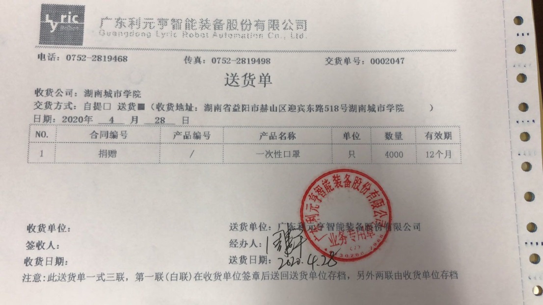 携手战疫情,广东利元亨智能装备股份有限公司向我校机械与电气工程学院捐赠防疫物资