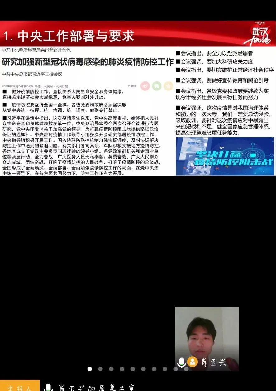 3月22日晚19:00,本学期第一次政治学习以特别的方式和各位橙子见面。各团支部主持人以展现PPT的形式,在直播平台上向橙子们讲述了关于“众志成城,抗击疫情”的四个部分。