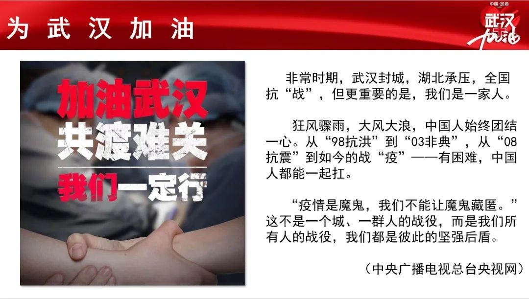 共克时艰,一方有难,八方支援。湖北有难,全国抗战,每一位在座的学子都为这个特殊时刻奉献了一点力量的事情。感谢挺身而出的人,幸得有你,山河无恙。